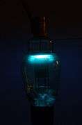 Under normal operating conditions the tube glows blue and mercury droplets are visible.