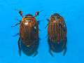 Color varies throughout the range of A. sulcatus and is not a good identifying characteristic, however; A. sulcatus shows many unique structural morphologies useful for identification. A. sulcatus is easily recognized by its large distinctive hind legs. The hind legs are long and fringed with setae, forming a paddle like shape when spread.[8] The body is always wider than the height of the insect, and is streamlined (no spines, or other chitinous structures protruding). As in all Dytiscidae beetles the sternal keel is absent. A. sulcatus is clumsy on land, but it is well adapted for an aquatic lifestyle and is a strong flier. A. sulcatus may also be recognized by unique reproductive structures. Males have 3 ventral suction disks used to secure the male to the slippery female during reproduction.[9] Male attachment to females is detrimental to female survival as the mating period may attract predators. To avoid potential mating costs (her life) females show modifications of the elytra. The elytra is highly grooved with many suberect setae,[10] making male attachment far more difficult. The male elytra is smooth without setae showing high levels of sexual dimorphism. The competition between the sexes has led to an evolutionary sexual arms race.