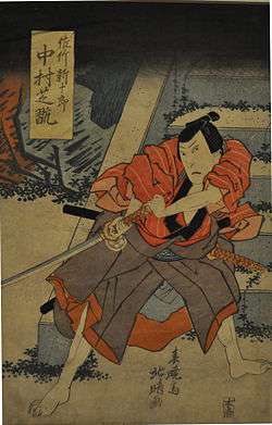 Literally "kabuki pictures", kabuki-e began to be produced in Edo in the late seventeenth century.[19] As kabuki grew in popularity, star actors emerged, which in turn led to yakusha-e (役者絵), a subgenre of kabuki-e in which actors were depicted individually, as in this print, or in pairs.[20][21] These images appeared as single-sheet prints or in books of actor prints called yakusha ehon (役者絵本).[22]