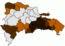 | Chiefly in Elías Piña, San Pedro de Macorís, Santo Domingo, and San Cristóbal; also in Dajabón, Pedernales, Independencia, La Romana and Hato Mayor | |