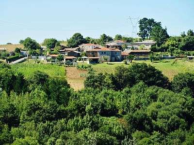 Aiazo is placed in the south-west of the municipality of Frades (Ordes' shire), 30 km driving from Santiago de Compostela and 50 km driving from Coruña. By the south, Aiazo borders with the Arzúa's shire, by the Tambre river; by the north and the east it borders with the rest of Frades, and by the west with the municipality of Oroso. The relief, characterized by the Maruzo river (in the north) and Tambre river (in the south), over a geological area determined by the schist complex of Ordes, forms a landscape with soft hills.[1] In Aiazo there are agrarian lands and forests around the populated areas. The forests are mostly of eucalyptus and pines in plantations, and Galician typical oak forest, with (oaks, birchs, alders, willows, etc. Another frequent kind of forest in Aiazo is the riverbank forest near the Tambre, Gaiteiro, and Maruzo rivers. Maruzo's riverbank is part of the Río Tambre's ecological network Natura 2000, this protection will be increased in the future to the Tambre's riverbank. In the beginning, Aiazo's population was concentrated in the three principal neighborhoods, born around an aquifer. Historically Fontelo, Fonsá and A Devesa were the most important villages, the three with similar characteristics of terraced houses. To complement the three first settlements, country houses appeared, like Os Pereiros, in A Devesa, or O Casal, in Fontelo, and new settlements grew, like A Torre or A Carballeira. In the late 20th century, it appeared lots of isolated houses, some of them following a ribbon development in the way between Ponte Carreira and Ordes, and other around the primary neighborhoods.[1] Population ageing is a phenomenon occurring in Aiazo, although in the last years tendency is to receiving immigrants, especially because of the 2008 crisis.