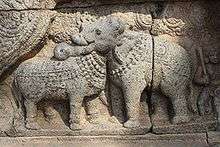 The north wall of the verandah consists of 108 sections of inscriptions, each containing the name and description and image of the 63 Saivacharya (Saivite saints) listing the principal events in their life.[6][7][8] This reflects the deep roots of Saivism in this region.[9] Other important sculptures of the temple are the 108 Devara Othuvars who sung in the temple during the time of Raja Raja II. There are sculptures for river goddesses like Cauvery, Ganges, Yamuna, Godavari and Narmada.[4]