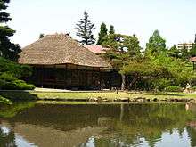 The Rakujutei is a tea ceremony cottage built on Naka shima or "Middle Island". It has an alcove with a rail and thatched roof. Feudal lords and the executives of the clan would enjoy tea ceremony here.
