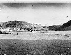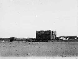 By 1907, the fort was being used as a telegraph station with three operators.[7] That year, French archaeologists A. Jaussen and R. Savignac carried out the first major excavation at al-Ukhaydir, producing photos, site plans and Arabic inscription squeezes.[7] They also identified an old mosque 400–500 meters north of the fort, which they claimed was the mosque Yaqut al-Hamawi associated with Muhammad centuries earlier.[7] At the time, local Arabs continued to inhabit the area, cultivating camel fodder and serving the garrison.[7]