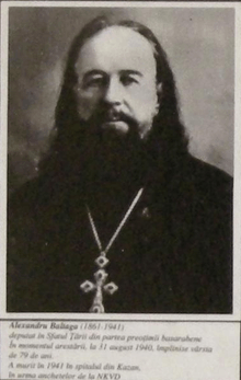Alexandru Baltagă (April 14, 1861 - August 7, 1941) was a Bessarabian Romanian Orthodox priest, a founder of the Bessarabian religious press in the Romanian language, a member of Sfatul Ţării (1917–1918), a Soviet political prisoner, and, according to the Orthodox Church, a martyr for the faith.