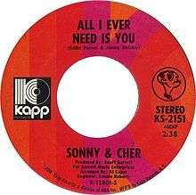 "All I Ever Need Is You" is a popular song written by Jimmy Holiday and Eddie Reeves and recorded by Ray Charles for his 1971 album The Volcanic Action of My Soul. The most well-known version of the song is the hit single from Steve & Eydie, Sonny & Cher and Mouth & MacNeal. It reached number seven on the U.S. Billboard Hot 100. It is their single of greatest longevity, spending 15 weeks on that chart.