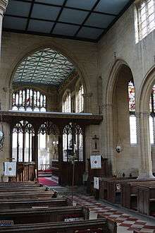 It was restored between 1874 and 1875 by George Gilbert Scott. He had been born in the nearby village of Gawcott and this building was one of the inspirations for his interest in Gothic architecture. He restored it for free. It was reopened on 16 June 1875.[3] The roofs were replaced and a ceiling inserted with oak panels and mouldings. The old seats were restored and new ones made to match. The pulpit was remodelled. The screen was restored and installed to separate the chantry from the transepts. The Denton tomb in the chancel was repaired. The stained glass windows were relaid by Burlison and Grylls and a new window inserted which depicts the story of the parables.