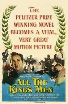 All the King's Men is a 1949 American film noir drama film set in a political setting directed by Robert Rossen and based on the Robert Penn Warren novel of the same name. The triple Oscar-winning production features Broderick Crawford in the role of the ambitious and sometimes ruthless politician, Willie Stark.[2]