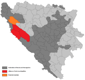 The Alliance of Serb municipalities (Bosnian: Savez srpskih općina, Serbian: Савез српских општина) is a union of Serb-inhabited municipalities (by majority) in the Federation of Bosnia and Herzegovina, outside of Serb-inhabited Republika Srpska. Currently the alliance includes three members in the Canton 10: Bosansko Grahovo, Glamoč and Drvar, and one in the Una-Sana Canton: Bosanski Petrovac. The first meeting was held in Grahovo on March 2013, and the plan is for the sessions to be held each month in a different municipality.