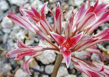 The fringed onion grows from a reddish-brown bulb one to two centimeters wide and sends up a naked brown or green stem. Atop the stem is an inflorescence of up to 75 flowers, each just under a centimeter wide on average. The flowers are variable in color, from pink to purple and often with white areas. The tepals are also variable in shape, from narrow and pointy to spade-shaped.[4]