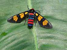Amata bicincta is a species of moth in the genus Amata (or Syntomis) of the family Arctiidae ("wooly bears" or "tiger moths"). It is also known as nine-spotted moth and handmaiden moth. It is a common day-flying warnignly colored moth. The adult is unpalatable to birds and other predators. It is found in the north-western Himalayas, Sikkim, Khasis and Bangladesh.[2]