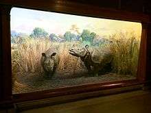The first Vernay-Faunthorpe expedition took place in 1922. At the time, many of the animals Vernay was seeking, such as the Sumatran rhinoceros and Asiatic lion, were already rare and facing the possibility of extinction. To acquire these specimens, Vernay would have to make many appeals to regional authorities in order to obtain hunting permits.[26] The relations he would forge during this time would assist later museum related expeditions headed by Vernay in gaining access to areas previously restricted to foreign visitors.[27] Artist Clarence C. Rosenkranz accompanied the Vernay-Faunthorpe expeditions as field artist and would later paint the majority of the diorama backgrounds in the hall.[28] These expeditions were also well documented in both photo and video, with enough footage of the first expedition to create a feature-length film, Hunting Tigers in India (1929).[29]