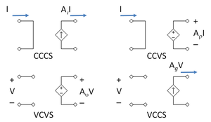 Electronic amplifiers use one variable presented as either a current and voltage. Either current or voltage can be used as input and either as output, leading to four types of amplifiers.[1] In idealized form they are represented by each of the four types of dependent source used in linear analysis, as shown in the figure, namely:
