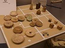 Findings include coins, tools, weapons, many horse fittings, small glass vessels, flat glass plates, furniture of stone, bone and wood, ceramic vessels and small earthenware objects. There is evidence of weaving and a smithy, with abundant metal objects.[6] These include ironwork from doors, furniture and chests.[3] The weapons do not include swords or lances, and suggest hunting rather than combat. Locally made chess pieces give evidence of an aristocratic lifestyle.[6]