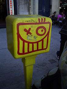 André's work has been exhibited in galleries and museums. In 2002, he opened the concept store "BlackBlock" in Paris at Palais de Tokyo ; a creation around which he organized concerts, parades and other performances, and whose profits were reinvested in new projects art.[1] In 2010, André appeared in Banksy's documentary Exit Through the Gift Shop. In 2011, he participated in MoCA Los Angeles' Art in the Streets exhibition.[5] The same year, his work was also displayed at the Grand Palais, Paris and the 54th Venice Biennale.[6] In 2014, a solo retrospective dedicated to his work was held at the Museu do Design e da Moda in Lisbon.[7]