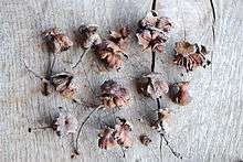Andricus dentimitratus is a gall forming wasp in the genus Andricus. The adults lay their eggs on various species of oak and the developing larvae causes the trees to create a large ornate gall. The oaks parasitised include Quercus frainetto, Q. petraea, Q. pyrenaica, Q. pubescens and Q. robur. The gall is formed out of the cup of the acorn. In cross-section it resembles a mushroom. It is woody, maroon, shiny and sticky. It grows up to 25 mm high and 20 mm wide. What resembles the head of the mushroom is lobed or toothed in various ways. The insect emerges from the narrowing, between the head and base.[1]