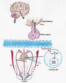 The synthesis of testosterone is mediated by a chain of processes that start in our brain. When our body detects a low level of testosterone, the hypothalamus starts to produce LHRH, an hormone which, once is received by the pituitary gland activates the synthesis of LH (Luteinizing hormone). LH travels to the testicles where induces the formation of testosterone.[10] There are two methods of androgen deprivation therapy based on drugs. One works preventing the pituitary gland from releasing LH and the other one blocks the body’s ability to use androgens.