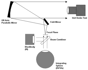 UV/visible light from an integrating sphere (and/or other source such as a black body) is focused onto a square test target at the focal plane of a collimator (the mirrors in the diagram), such that a virtual image of the test target will be seen infinitely far away by the camera under test. The camera under test senses a real image of the virtual image of the target, and the sensed image is displayed on a monitor.[9]