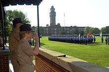 ![]() Rondeau reviews the recruits during a Pass-in-Review Ceremony held on Ross Field, Great Lakes, Illinois (IL). | |