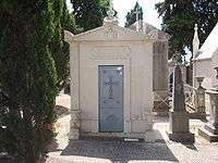 António José de Ávila died in Lisbon eight weeks after his 74th birthday. The Duke's state funeral, which occurred on 5 May 1881, left the Church of the Martyrs around 2:00, and its cortege arrived at the Prazeres Cemertary around 4:00 in the afternoon.[4] Its palm bearers included Fontes e Sampaio, the Duke of Palmela, the Marquis of Ficalho and the Duke of Loulé, who proceeded a group of 500–600 carriages, with more than a thousand people that included representatives of the Royal Family, State bodies, associations and many classes of the society.[5] A coach of the Royal House was provided to transport the body, followed by a carriage with the parish vicar of Martyrs Church and twelve priests.[6] This carriage was also followed by the António José de Ávila's nephew, and another carriage with Ducal crown on a black velvet pillow, followed by the 4th Regimental Cavalry and band. At the cemetery the Duke's body was transported down by Hintze Ribeiro, João Gualberto de Barros e Cunha, Carlos Bento da Silva, Dias de Oliveira, Reis e Vasconcelos, Carlos Zeferino Pinto Coelho and the Count d'Alte.[7] The cortege passed along the packed streets with many of the residents watching from their windows. The Duke had already planned his entombment: "...a small chapel of marble, of a simple architecture, with a small cross..in high relief the coat-of-arms of d'Ávila and Bolama with the Marqueses crown, with the titles 'Family of the Marquis d'Ávila and Bolama'".[8]