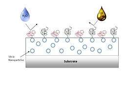 One of the newer additions to this ever growing market are nanoparticle based coatings. Silica particles are formed using the sol-gel method. The resulting silica particles have both reactive (Si-OH) and nonreactive (Si=O) groups on the surface. The reactive groups provide locations for further chemical processing, which allow you to change the surface properties of the nanoparticles. For anti-graffiti coatings, hydrophobic and oleophobic (oil-fearing) ligands are grafted onto the silica nanoparticles. Hydrophobic ligands are non-polar molecules such as hydrocarbon chains. Oleophobic ligands consist of polar molecules. Normally these two different types of molecules would phase separate in solution, for the same reason that water and oil do not mix. By chemically grafting the ligands onto the silica particles, this effect is counteracted. The effect is a coating that shows an equal dislike for both water-based and oil-based paints.[6]
