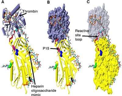 - 1 2 3 Li W, Johnson DJ, Esmon CT, Huntington JA (2004). "Structure of the antithrombin-thrombin-heparin ternary complex reveals the antithrombotic mechanism of heparin". Nature Structural & Molecular Biology. 11 (9): 857–862. doi:10.1038/nsmb811. PMID 15311269.