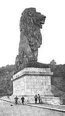 Bouré's reputation rests primarily on his large sculptural lions, characterized by their athletic musculature and majestic air.[20] The most famous of these is the colossal lion that sits atop the Gileppe Dam "like a cat on a garden wall."[21] The Gileppe lion stands 13.5 meters tall (around 44 feet).[22] Weighing 130 tonnes, it was constructed from 183 blocks of sandstone brought to the site by horse-drawn carts.[23]