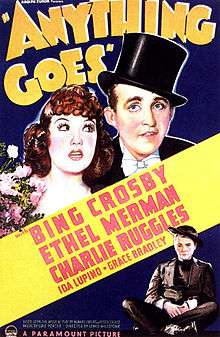 Anything Goes is a 1936 American musical film directed by Lewis Milestone and starring Bing Crosby, Ethel Merman, Charles Ruggles, and Ida Lupino.[1] Based on the stage musical Anything Goes by Guy Bolton and P.G. Wodehouse, the stage version contains songs by Cole Porter. The film is about a young man who falls in love with a beautiful woman whom he follows onto a luxury liner, where he discovers she is an English heiress who ran away from home and is now being returned to England. He also discovers that his boss is on the ship. To avoid discovery, he disguises himself as the gangster accomplice of a minister, who is actually a gangster on the run from the law. The film required revisions of Porter's saucy lyrics to pass Production Code censors. Only four of his songs remained: "Anything Goes", "I Get a Kick Out of You", "There'll Always Be a Lady Fair", and "You're the Top". "You're the Top" contained substantially revised lyrics, and only the first verse (sung by Ethel Merman during the opening credits) was retained from the song "Anything Goes".