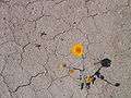 A desert marigold pushes its way through the dry, cracked, and sun-hardened desert after a rare and substantial rainfall