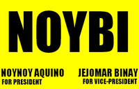 The Noynoy-Binay campaign or NoyBi began when Senator Francis Escudero endorsed the candidates Benigno "Noynoy" Aquino III and Jejomar Binay as President and Vice President respectively. This was done without the consent of the two candidates, especially since Escudero, Binay, and Aquino all come from different political parties. Aquino had Manuel "Mar" Roxas II as his running mate for Vice President, while Binay was the Vice Presidential candidate of Joseph Estrada, who was aiming to be elected president for a second time. The campaign was nonetheless successful as Aquino and Binay were elected as President and Vice President of the Philippines.[4]