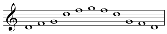 The tonal levels, or axial pitches, begin in the lower register and gradually rise to the highest at the climax before descending again, for example (in European-influenced notation):