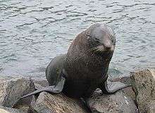 Arctocephalus forsteri, the New Zealand fur seal, southern fur seal or long-nosed fur seal, is a species of fur seal found around the south coast of Australia, the coast of the South Island of New Zealand, and some of the small islands to the south and east of there.[1] Male-only colonies are also located on the Cook Strait coast of the North Island near Wellington[2] and vagrants are found as far north as New Caledonia. The name New Zealand fur seal is used by English speakers in New Zealand (kekeno is used in the Māori language), and southern fur seal by speakers in Australia. As of 2014, the common name long-nosed fur seal has been proposed for exclusive use within Australia.[3] Although the two populations show some genetic differences, their morphologies are very similar, and thus they remain classed as a single species.[1]
