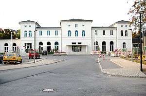 The Arnsberg (Westphalia) station is a station on the Upper Ruhr Valley Railway (German: Obere Ruhrtalbahn) in the German state of North Rhine-Westphalia. It was opened in Arnsberg with the construction of the line in 1870/71.[3] The station building was built in 1869 in the Renaissance Revival style.[4] The station building is still used for passenger traffic. Some of the space in the building is used by various social groups and institutions.