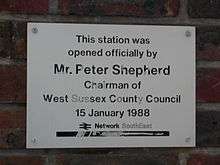A station building similar to that at Arundel was provided; this lasted until 1937, after which redevelopment was severely delayed by the Second World War and planning disputes.[4] One original structure remained until 1986, when Network SouthEast started building a new concourse and ticket office. This was finished late in 1987, and was officially unveiled on 15 January 1988.[5][6] [7] The line was electrified in 1938, with an official unveiling ceremony being held on 30 June 1938.[8] The station handled goods traffic until 1970.[9]