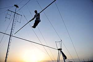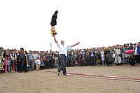 This year's highlight was an exhibition of Akhal-Teke horses, whose beauty, grace and skills had been charming people around the world for 5,000 years.[15] Scores of motley yurts, pavilions and cafes offering national culinary delights were mounted at the foot of the Tuproq Qala citadel while young lads dressed like warriors were standing as historical guards on top of the old walls of the fortress along its perimeter.[16]