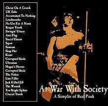 At War With Society[1] is an internationally distributed compilation album[2][3] mostly of artists that are on New Red Archives records. It was originally released in 1998[4] as a 33 song CD, but was then subsequently also released on CD with one less number of tracks. The album was compiled by New Red Archives. As of May 1999, it had reached sales of 77,000+ copies.[5] The second version[6] of the album (on New Red Archives/PHD Records) was issued with an alternate cover. The second version was compiled and released in 1999.
