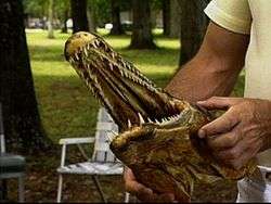 On September 4, 2009 a 3 ft 3 in (0.99 m) alligator gar was found in Tak Wah Park in Tsuen Wan, Hong Kong. Over the next two days, at least 16 other alligator gar, the largest measuring 4.9 ft (1.5 m), were found in ponds in public parks in Hong Kong.[27] Nearby residents reported the alligator gar had been released into the ponds by aquarium hobbyists, and had lived there for several years. However, after a complaint made by a citizen who falsely identified alligator gar as crocodiles, the use of terms like "horrible man-eating fish" had begun appearing in the headlines of some major local newspapers. Officials with Leisure and Cultural Services in Tak Wah Park removed all the alligator gar from the ponds because they were concerned the large, carnivorous fish might harm children.[28] It is not unusual for the large sharp teeth and outward appearance of alligator gar to precipitate unreasonable fear in those unfamiliar with the species. Sensationalized reports have contributed to the misconception of predatory attacks by alligator gar on humans even though none of the reports have been confirmed.[29]
