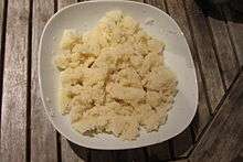 Attiéké (also spelled acheke)[1] is a side dish made from cassava that is a part of the cuisine of Côte d'Ivoire in Africa.[2] The dish is prepared from fermented cassava pulp that has been grated or granulated.[3] Dried attiéké is also prepared, which is similar in texture to couscous.[3] It's a common and traditional dish in Côte d'Ivoire that originated in the southern part of the country,[4] and methods for its production are well known in Côte d'Ivoire and also in Benin.[3] In Côte d'Ivoire, the dish is often served with Kedjenou, a slow-cooked stew.[5] Fresh attiéké can spoil quickly, and should generally be consumed within 24 hours after preparation.[6] Its short-term perishability has created some problems in its mass distribution from rural areas to urban environments.[6]