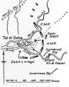 At 09:00 the regiment and the Somerset Battery RHA were ordered to attack Saba, to the east of Beersheba, positioned between the Canterbury Mounted Rifles on their right and the 3rd Light Horse Regiment on their left. The 11th Squadron, leading, advanced up a wadi under machine-gun fire, but there was plenty of cover for the men and horses. The squadron dismounted one hundred yards (91 m) from the Turkish front line and continued on foot. The 3rd and 4th Squadrons meanwhile had rode to within eight hundred yards (730 m) to the north, then dismounted to continue on foot. Advancing by troops, covered by their machine-guns, good progress was made.[66][67] At 14:10 the regiment was ordered to assault the position. Thirty minutes later, a hill four hundred yards (370 m) east of Saba was taken with sixty prisoners and three machine-guns. A short while later, Saba itself was captured with 132 prisoners and four machine-guns. However, the regiment had six dead and twenty-two wounded, including a squadron leader.[68][69]