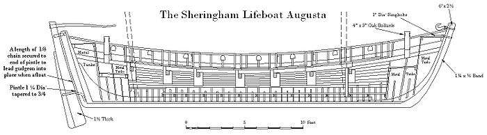 The new lifeboat was built a local man known as ‘Old Newlyn’,[2] who is thought to have been a member of the Lown[2] boat building family. The boat was built in the style of the local herring fishing boats. The Augusta was 33 feet 6 inches[3] long and 10 foot 3 inches[3] wide. The power for the boat was provide by 16 oars.[2] She was equipped with a dipping lug mainsail, mizzen sail and had fittings for a rudder at either end to avoid turning her in heavy seas.[3] The boat was constructed within Sheringham Park using local timber.