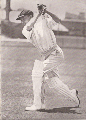 Donald George Bradman, better known as Don Bradman or The Don, was the greatest batsman of all time, ranked first in ESPN's Legends of Cricket and can be statistically regarded as the greatest sportsman of all, as "no other athlete dominates an international sport to the extent that Bradman does cricket".[7] His unorthodox grip meant he could not cream the ball through the covers like Wally Hammond and purists contend that Jack Hobbs was better on a sticky wicket, but on any pitch that did not make batting a lottery he simply made more runs. He made them fast too, until the 1990s his 3.7 runs per six ball over in Tests was the fastest scoring rate of any batsmen except Gilbert Jessop (4.2).[8] Even if his pre-war career was ignored his feats would make him the greatest batsman of all time; 680 runs (97.14) against England in 1946–47, 715 runs (178.75) against India in 1947–48 and 508 runs (72.57) in England in 1948, with 8 hundreds in his last 15 Tests. Ironically he was bowled by an Eric Hollies googly for a duck in his final Test innings when he was 4 runs short of a batting average of 100.00, he had to settle for 99.94.