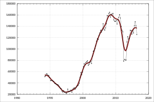 As of 27 February 2014, the gross Australian government debt was A$300.63 billion; at 15 August 2014 it was A$326.55 billion; and at 13 March 2015 it was $361.09 billion, an increase of AUD$2.05 billion from 6 March 2015; at 22 January 2016 it was A$405.988 billion[4] The government debt fluctuates from week to week depending on government receipts, general outlays and large-sum outlays. Australian government debt does not take into account government funds held in reserve within statutory authorities such as the Australian Government Future Fund, which at 30 September 2015 was valued at A$117.83 billion, and the Reserve Bank of Australia. Nor is the net income of these statutory authorities taken into account. For example, the Future Fund net income in 2014/15 was A$15.61 billion, which went directly into the fund's reserves. Also, guarantees offered by the government do not figure in the government debt level. For example, on October 12, 2008, in response to the Economic crisis of 2008, the government offered to guarantee 100% of all bank deposits. This was subsequently reduced to a maximum of $1 million per customer per institution. From 1 February 2012, the guarantee was reduced to $250,000,[5] and is ongoing.