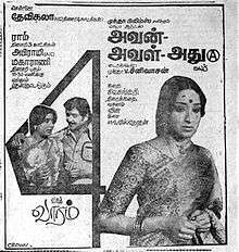 Avan Aval Adhu (Tamil: Him, Her, It) is a 1980 Indian Tamil-language film, directed by Muktha Srinivasan and produced by S. Sundar. The film stars Sivakumar, Lakshmi, Sripriya and Thengai Srinivasan in lead roles. The film had musical score by M. S. Viswanathan.[1][2][3] The movie was based on the story Oru Singam Muyalaagirathu written by Sivasankari.
