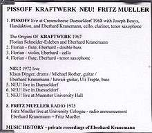 Pissoff was a band founded in the late 1960s by Eberhard Kranemann and some friends. Eberhard had studied under Joseph Beuys and the artist is featured with Pissoff on the first track, recorded in Düsseldorf's Creamcheese club. Shortly after this recording Florian Schneider joined the band. An unedited version of this track was also released separately by Kranemann.