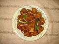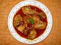 Korma is actually the Indian name for the technique of braising meat. It originated in the lavish Moghul cuisine wherein lamb or chicken was braised in velvety, spiced sauces, enriched with ground nuts, cream and butter. While kormas are rich, they are also mild, containing little or no cayenne or chillies.[4] There are both vegetarian (navratan korma) and non-vegetarian (chicken, lamb, beef and fish korma) varieties of korma. Murgh Awadhi Korma is a classic from Lucknow.[5]