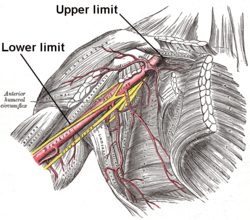 Axillary artery and its branches - anterior view of right upper limb and thorax. Upper and lower limits labeled. | |