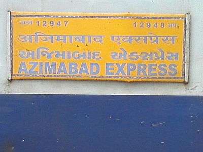 The Azimabad Superfast Express is a superfast train running between two capital city of Gujarat in Ahmedabad and Bihar in Patna. "Azimabad" was old name of patna city during later Mughal period.