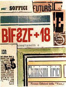 BÏF§ZF+18 Simultaneità e Chimismi lirici (BÏF§ZF+18. Simultaneity and Lyrical Chemistry) is a poetry book and artist's book published in 1915 by the Italian futurist Ardengo Soffici. Despite its rarity, the book has become famous as one of the finest examples of futurist 'words-in-freedom', and has been described as 'absolutely the most important book that came out of Florentine Futurism'.[1]
