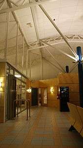 The terminal consists of a single building, with an integrated control tower, capable of handling 120 passengers per hour.[15] The facade is covered in Russian larch;[16] the focus on wood as a dominant material was common for Norwegian architecture the 1990s, and is also seen at Oslo Airport, Gardermoen (opened in 1998) and for the venues of the 1994 Winter Olympics.[5] The terminal was designed by Alta-based architect Solveig Thorsen and is shaped like an aircraft wing, similar to the terminal building at Gardermoen. There is a single gate at the airport, which prior to the installation of security control was 17 steps from the entrance.[16]