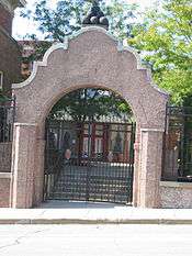 Palmer started to build a garden along the north side of the house in 1924 that he called A Little Bit O’ Heaven. It was largely a collection of artwork and artifacts that Palmer and his wife, Mabel, collected on their trips to Asia and Europe. Part of the collection was also kept on the porch. A courtyard contained items such as totem poles, statues of deer, birds and the birth of Venus. There was a rock lined corridor called “purgatory” that led to the heart of the exhibit that contained a large greenhouse with a waterfall of 40 feet (12 m) and a pond that was filled with tropical fish, alligators and Oriental art.[6] The site also contained what Palmer claimed was the smallest chapel in the world, it was eight feet square, and thousands of people wed there.[7] For a small fee the public was allowed to visit the site. It was one of the most popular attractions in Davenport.[7] After Palmer’s death in 1961 A Little Bit O’ Heaven started to decline and it was closed to the public in 1981 and it was dismantled in 1983.